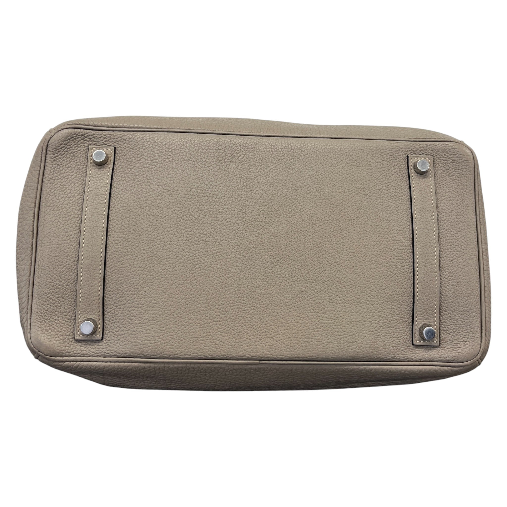 This gorgeous Birkin 35 is crafted from luxurious Togo leather in the classic Gris Etain complemented with the iconic palladium hardware. Year: 2009 (Stamp M in square) Includes: Clochette, padlock and keys. Carefully maintained and gently used, the bag remains in excellent condition with only very gentle surface wear to the back right corner as pictured. The centre of the inner handles have a 6.5cm surface area where the glazing has worn off on the piping, this can be repaired at Hermes spa. Handles themselves are in very good condition. The body of the bag is in beautiful condition, and the interior is excellent.