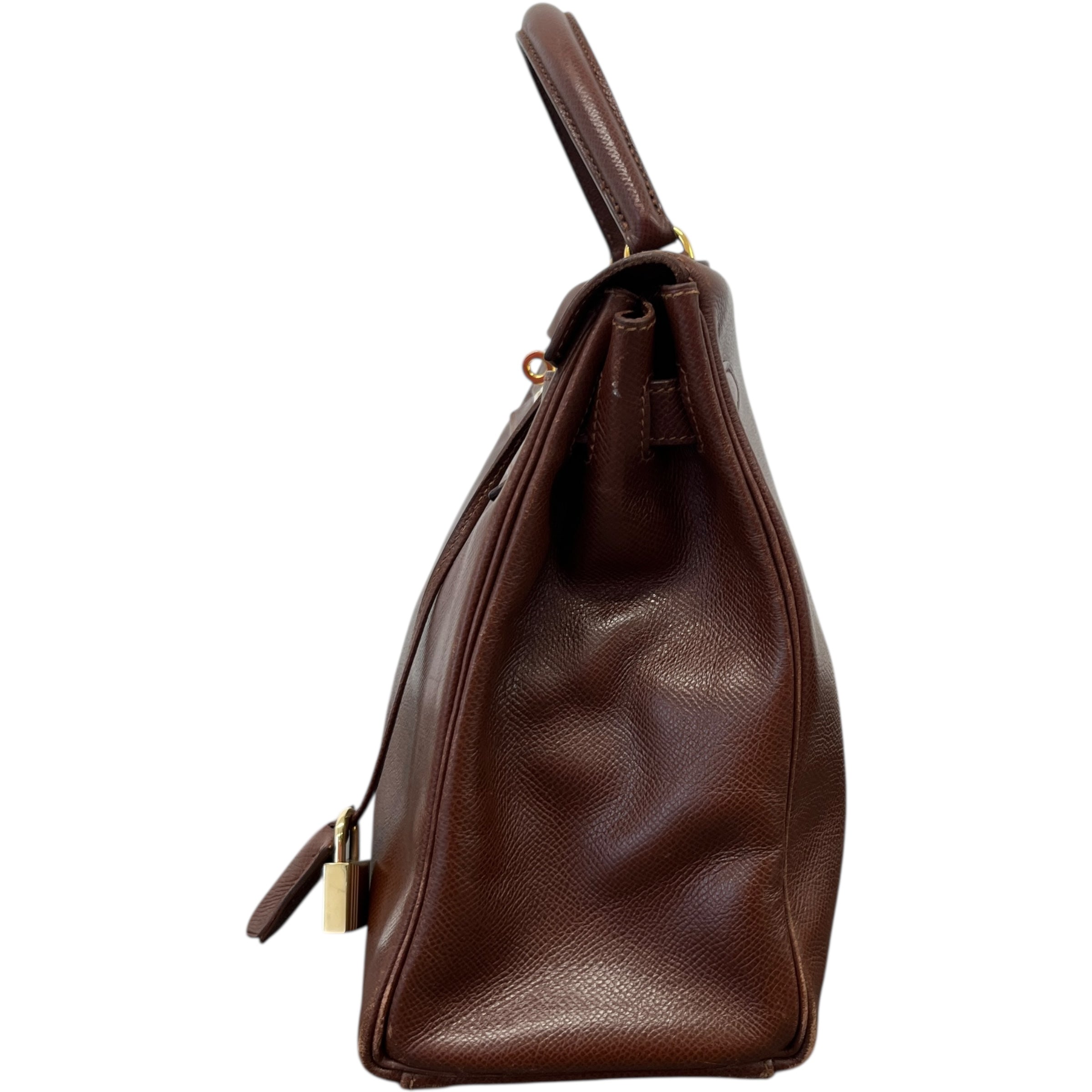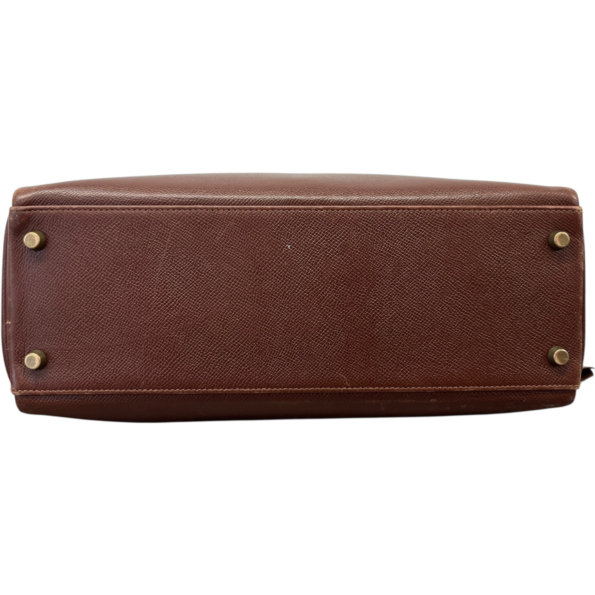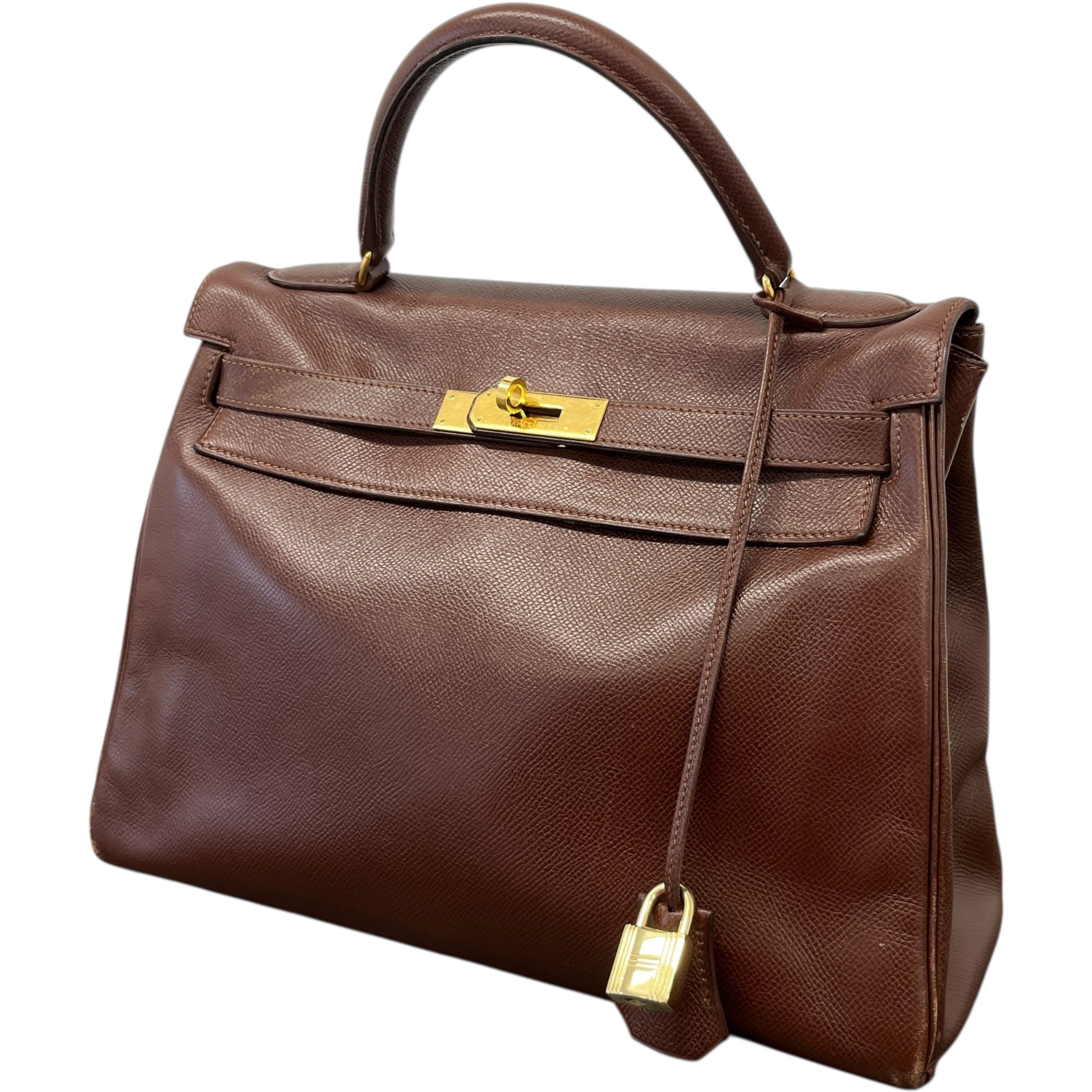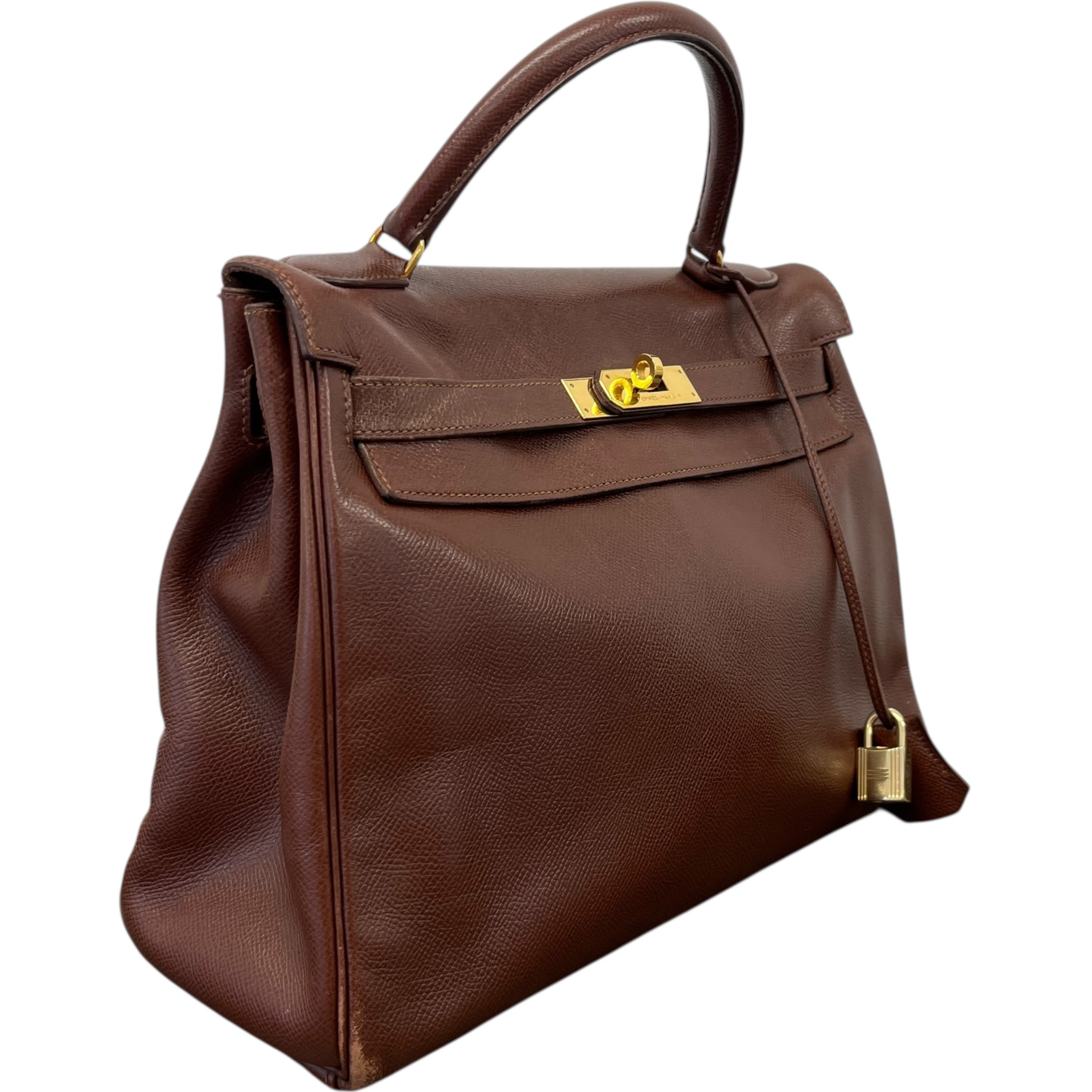 Comments This exquisite Kelly 32 is crafted from premium Courchevel leather in a rich brown hue, complemented by elegant gold hardware. A timeless vintage piece. Year: 1991 (Stamp U in Circle) Includes: Padlock, keys The bag remains in excellent vintage condition, showing only light surface level wear to the bottom corners consistent with gentle use, as detailed in the photos. The interior lining is pristine, reflecting careful ownership over the years.