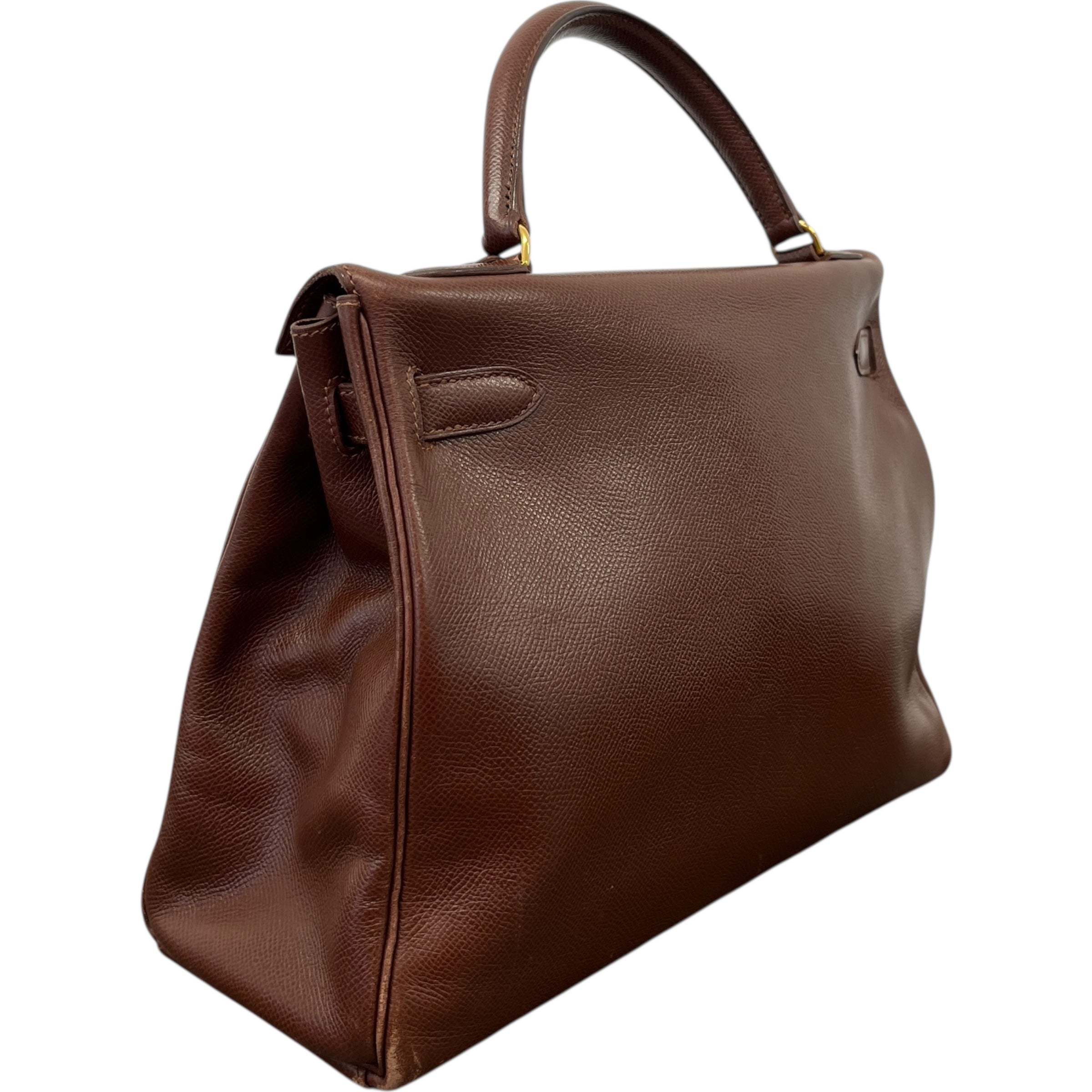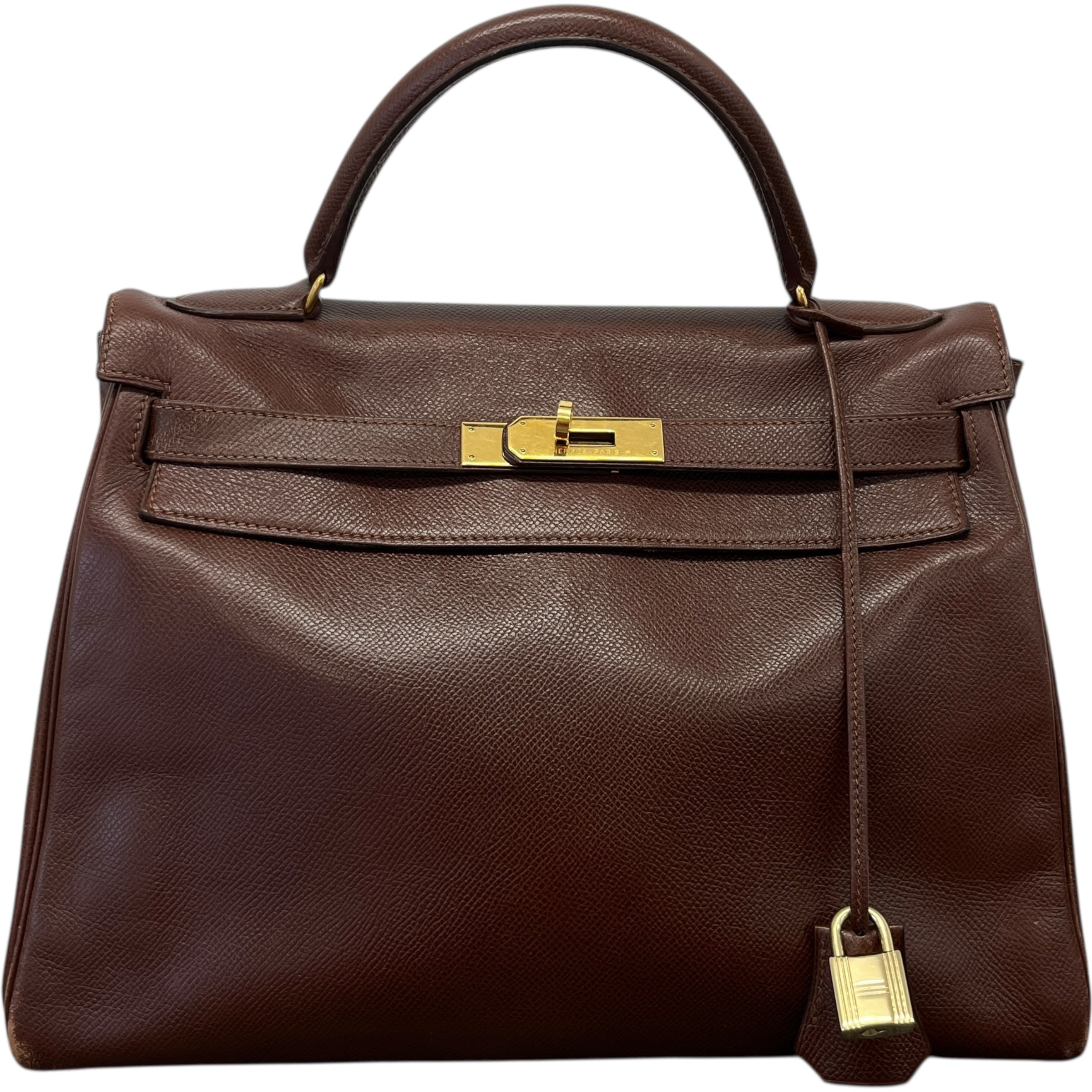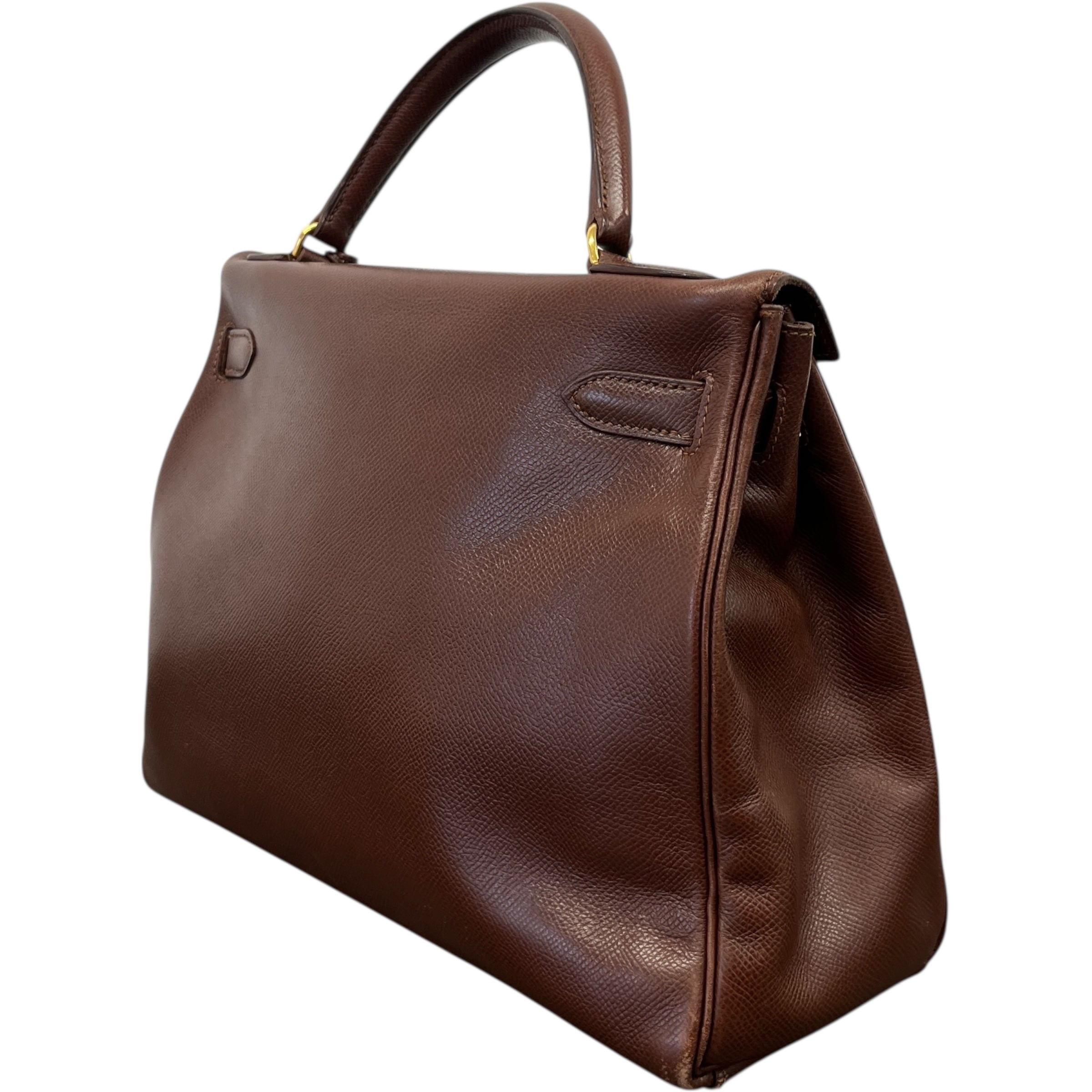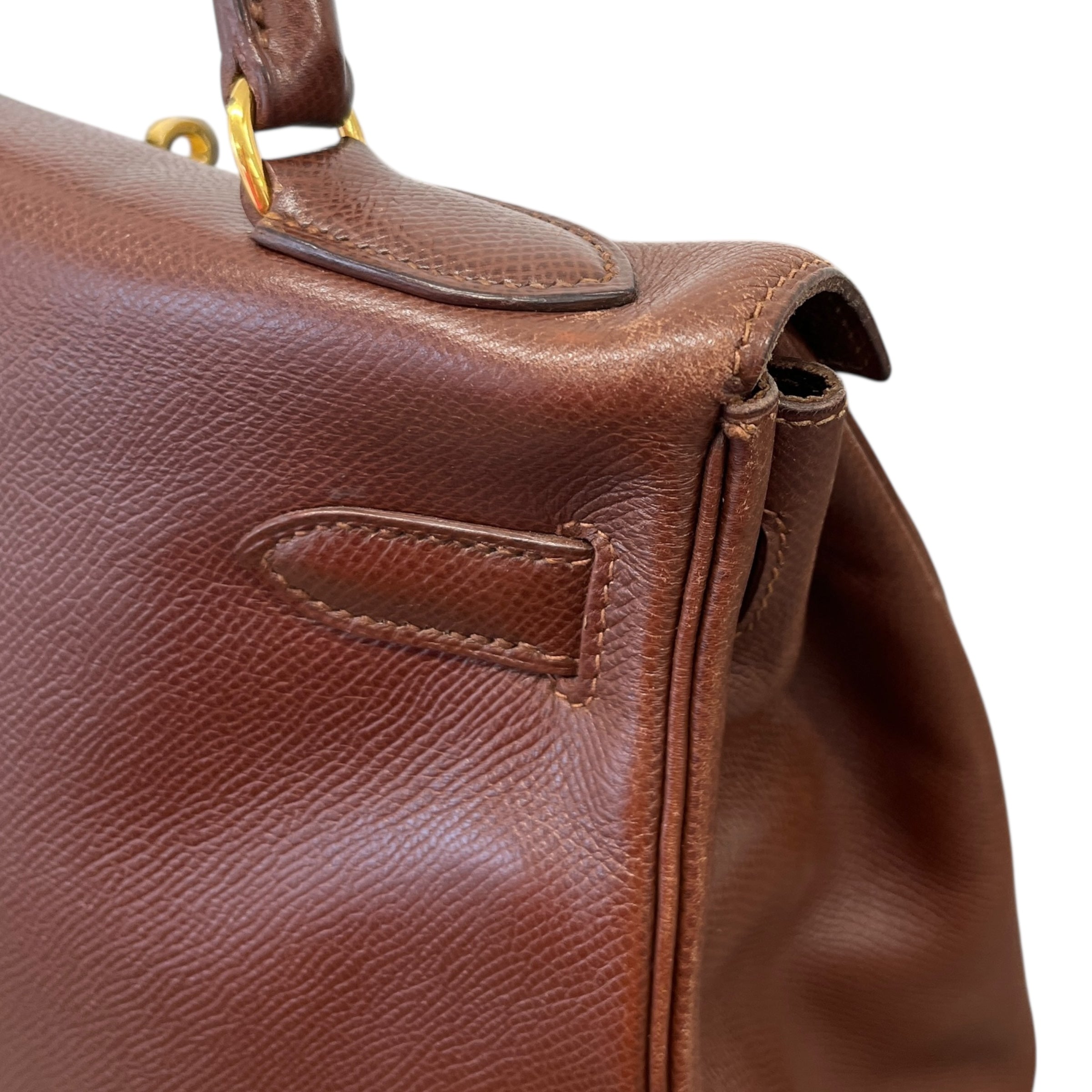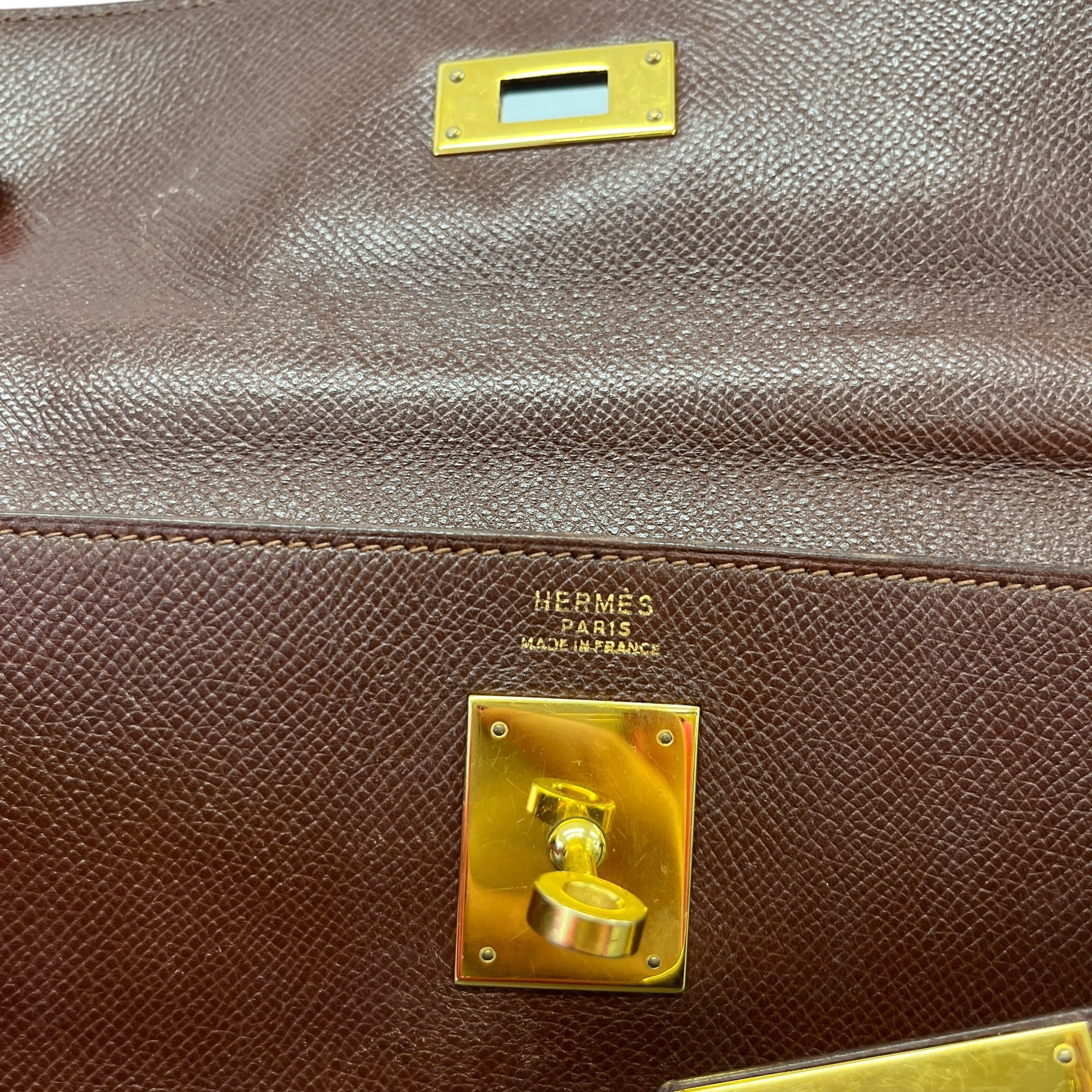 Comments This exquisite Kelly 32 is crafted from premium Courchevel leather in a rich brown hue, complemented by elegant gold hardware. A timeless vintage piece. Year: 1991 (Stamp U in Circle) Includes: Padlock, keys The bag remains in excellent vintage condition, showing only light surface level wear to the bottom corners consistent with gentle use, as detailed in the photos. The interior lining is pristine, reflecting careful ownership over the years.