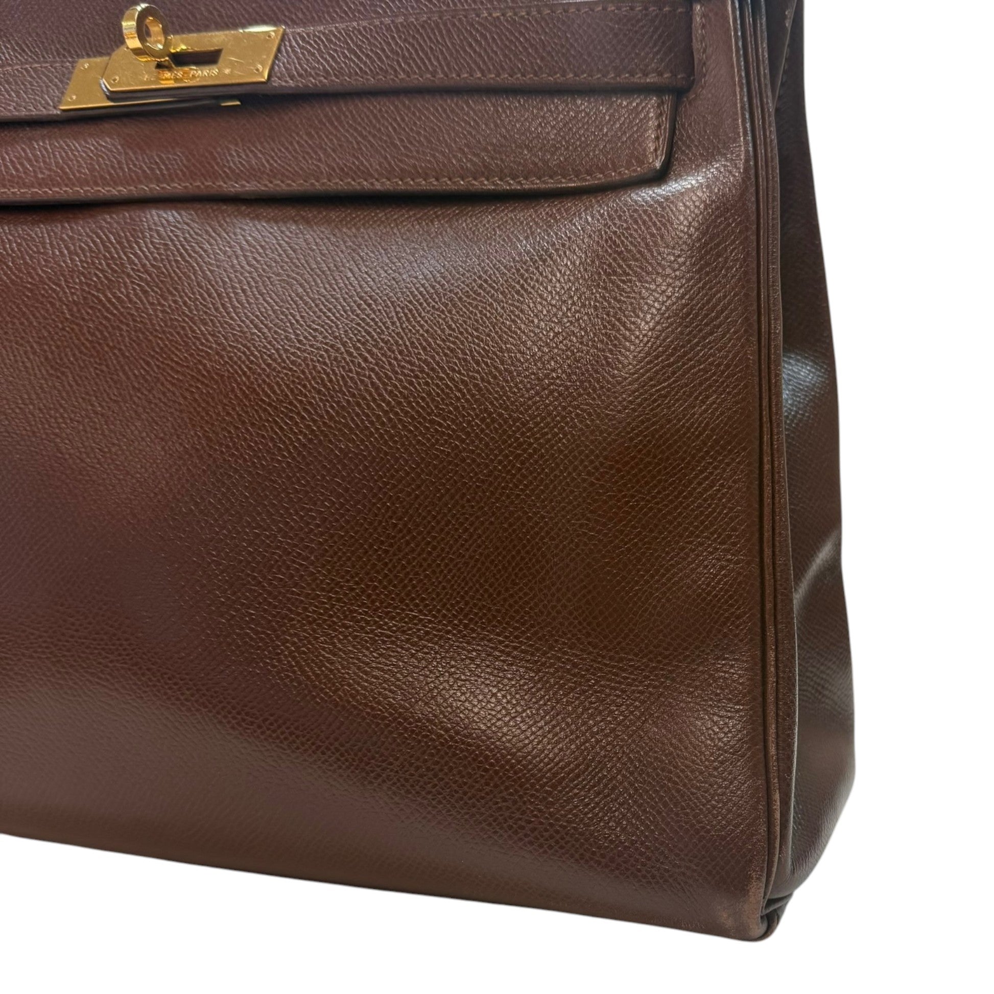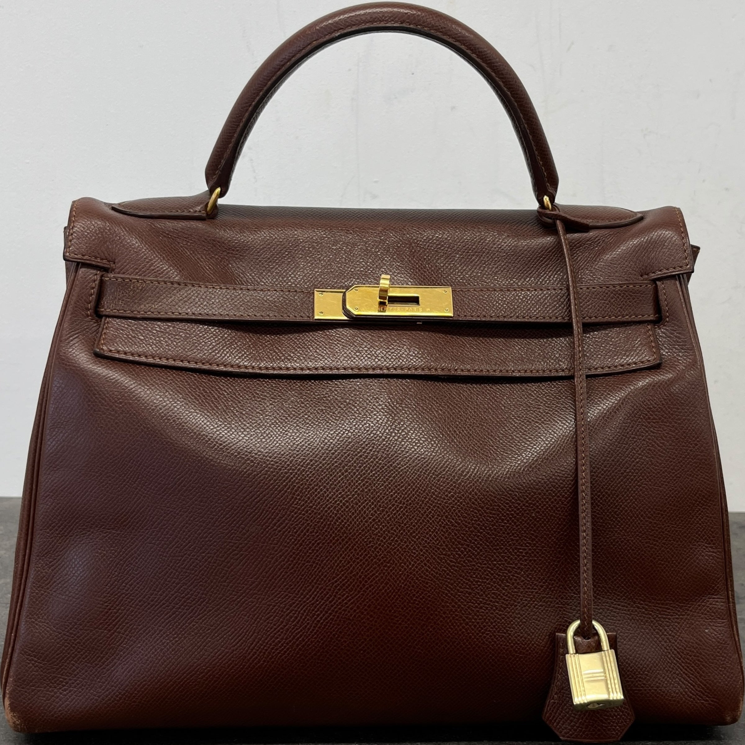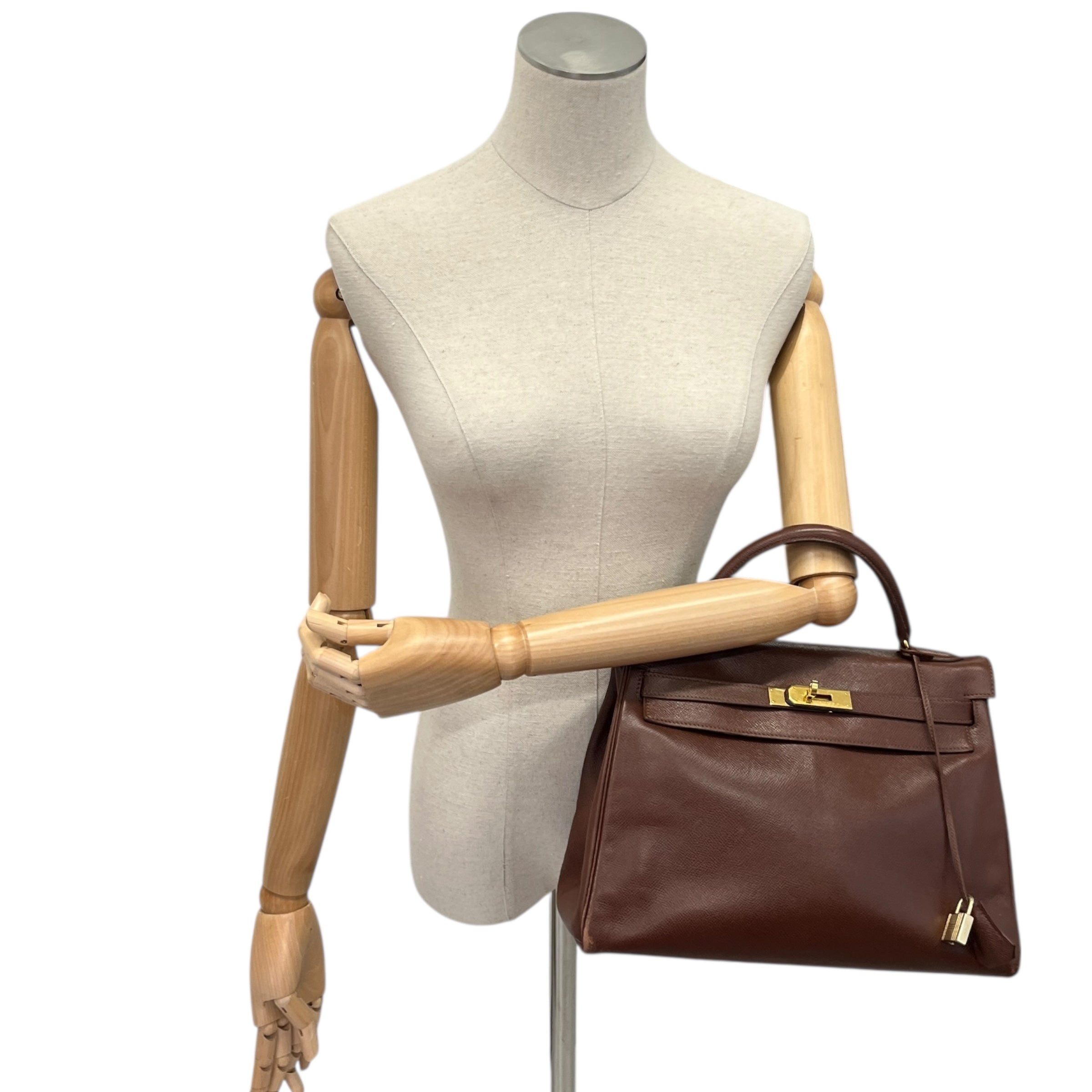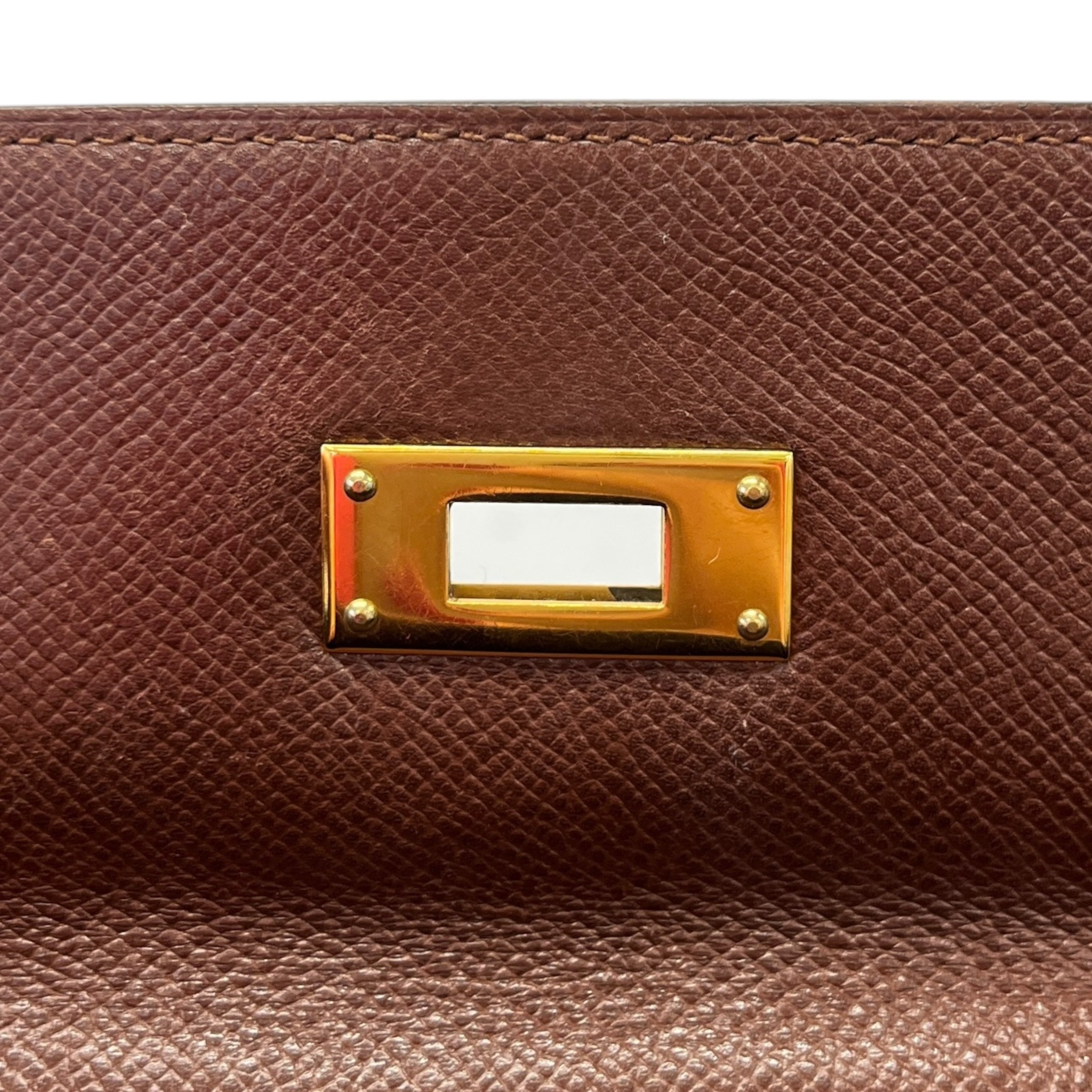Comments This exquisite Kelly 32 is crafted from premium Courchevel leather in a rich brown hue, complemented by elegant gold hardware. A timeless vintage piece. Year: 1991 (Stamp U in Circle) Includes: Padlock, keys The bag remains in excellent vintage condition, showing only light surface level wear to the bottom corners consistent with gentle use, as detailed in the photos. The interior lining is pristine, reflecting careful ownership over the years.