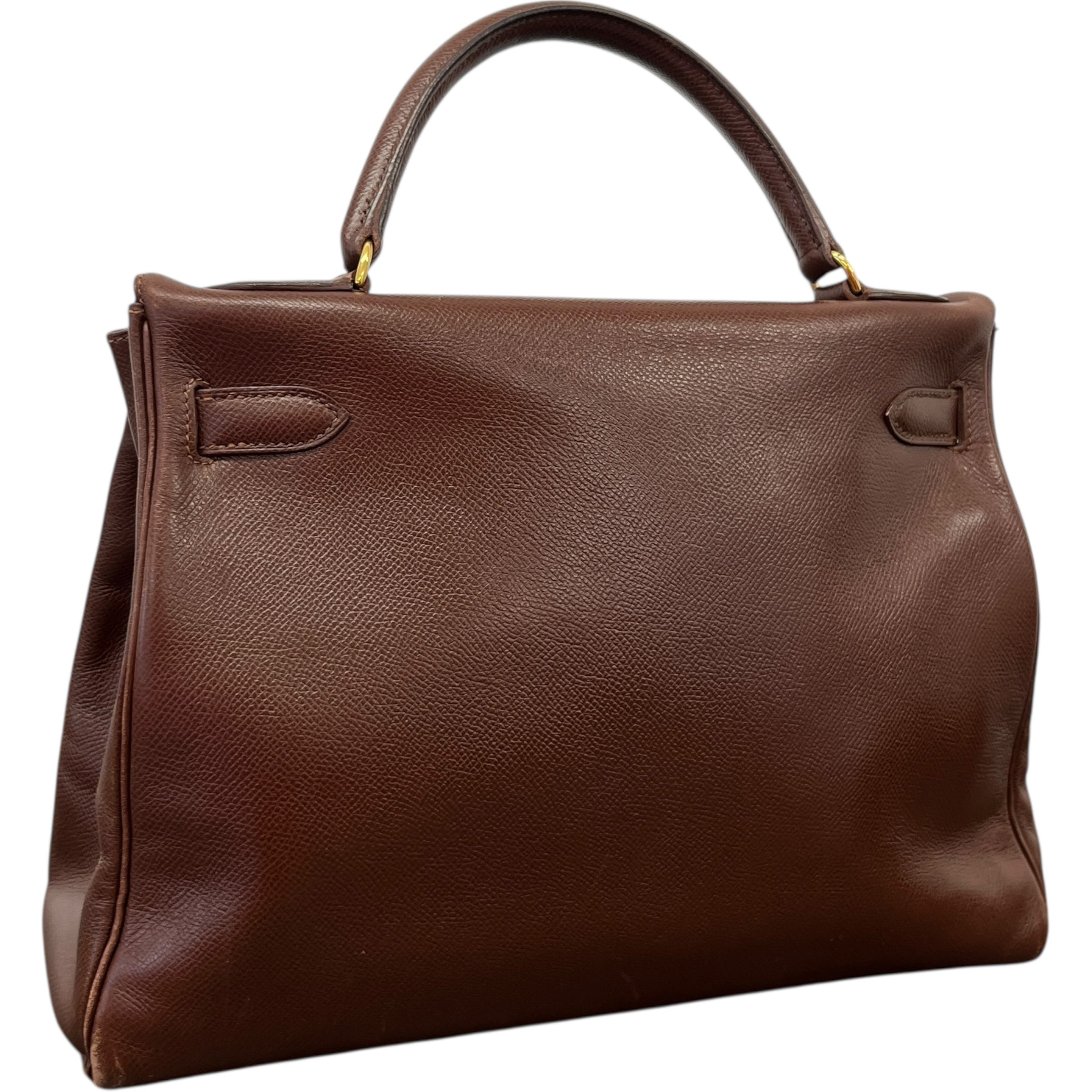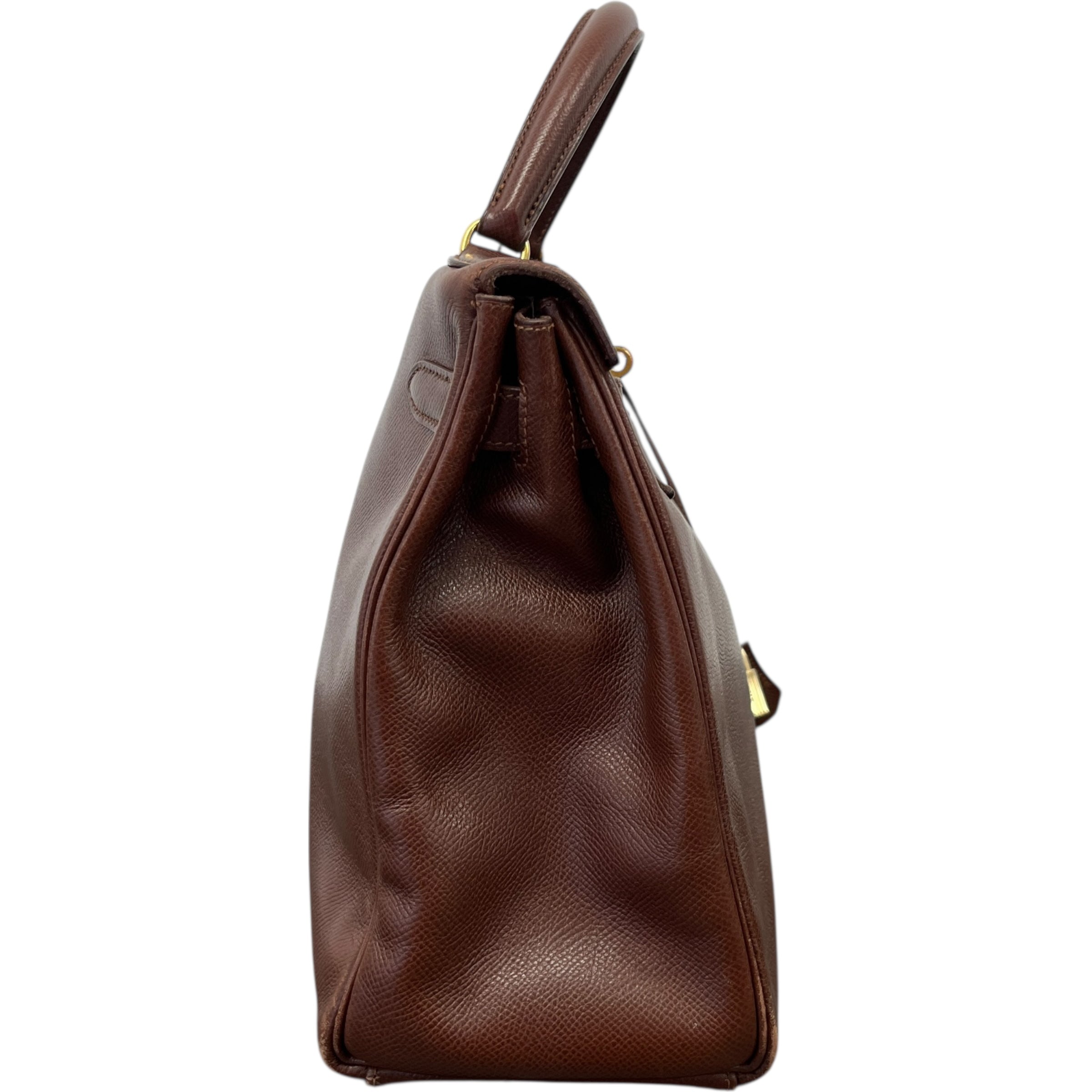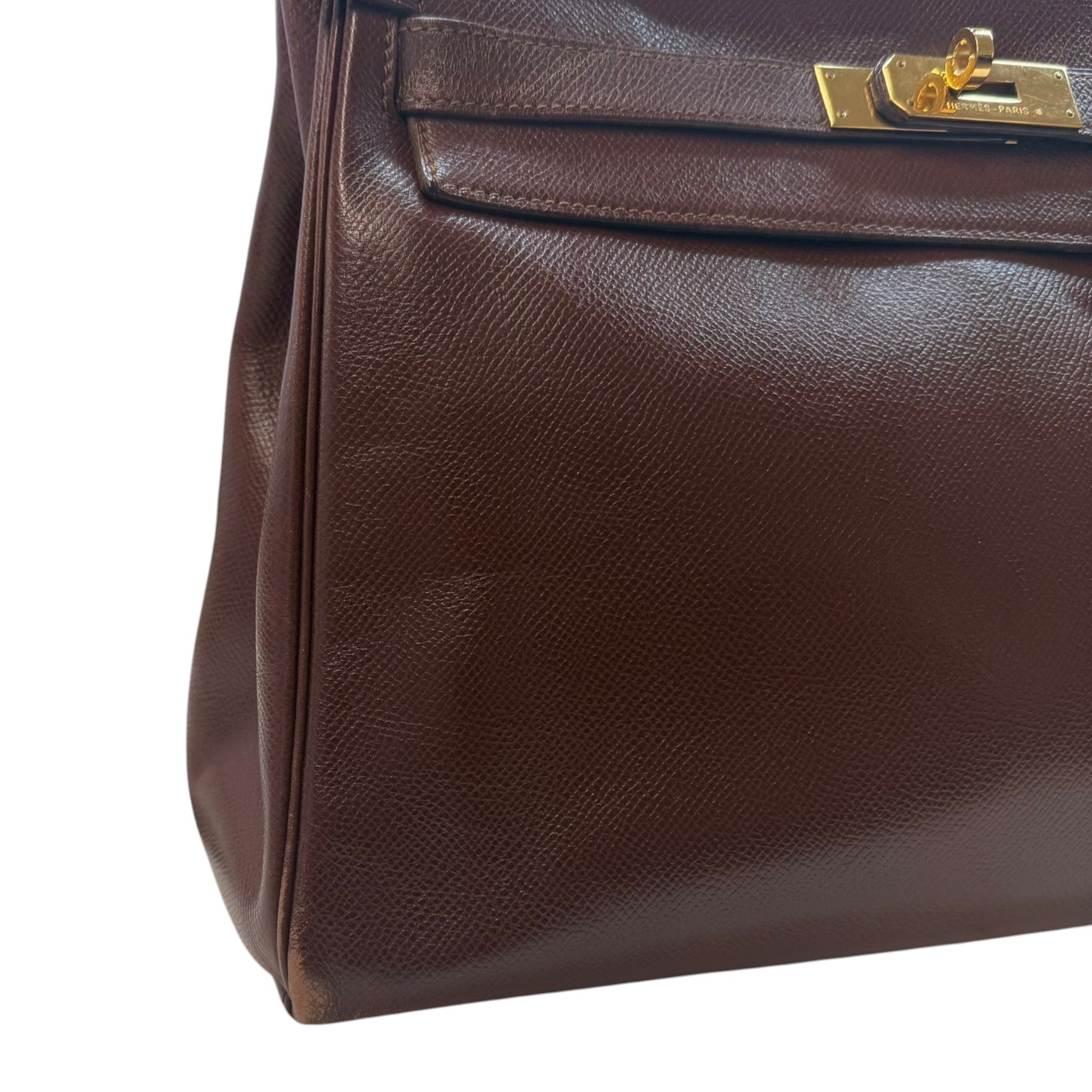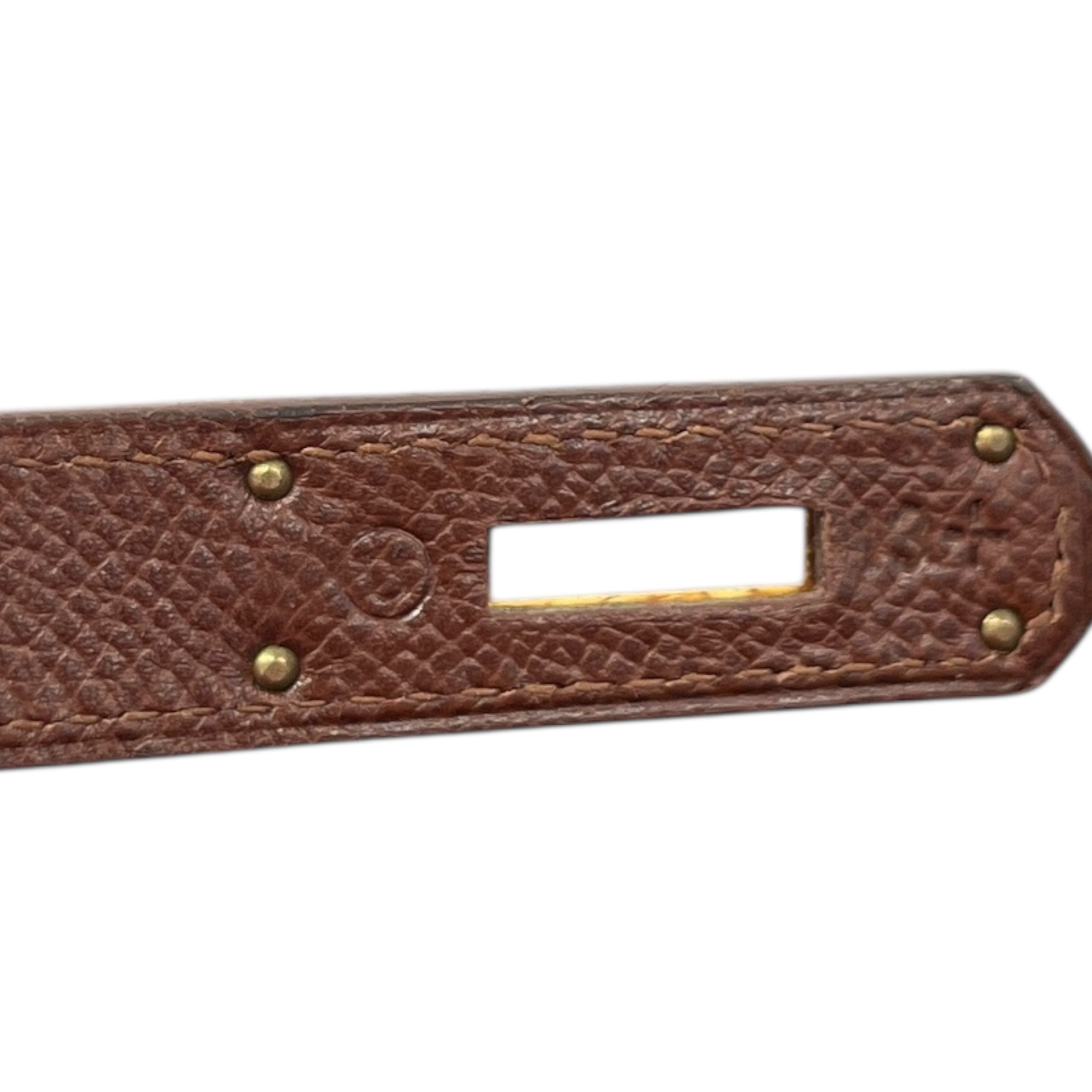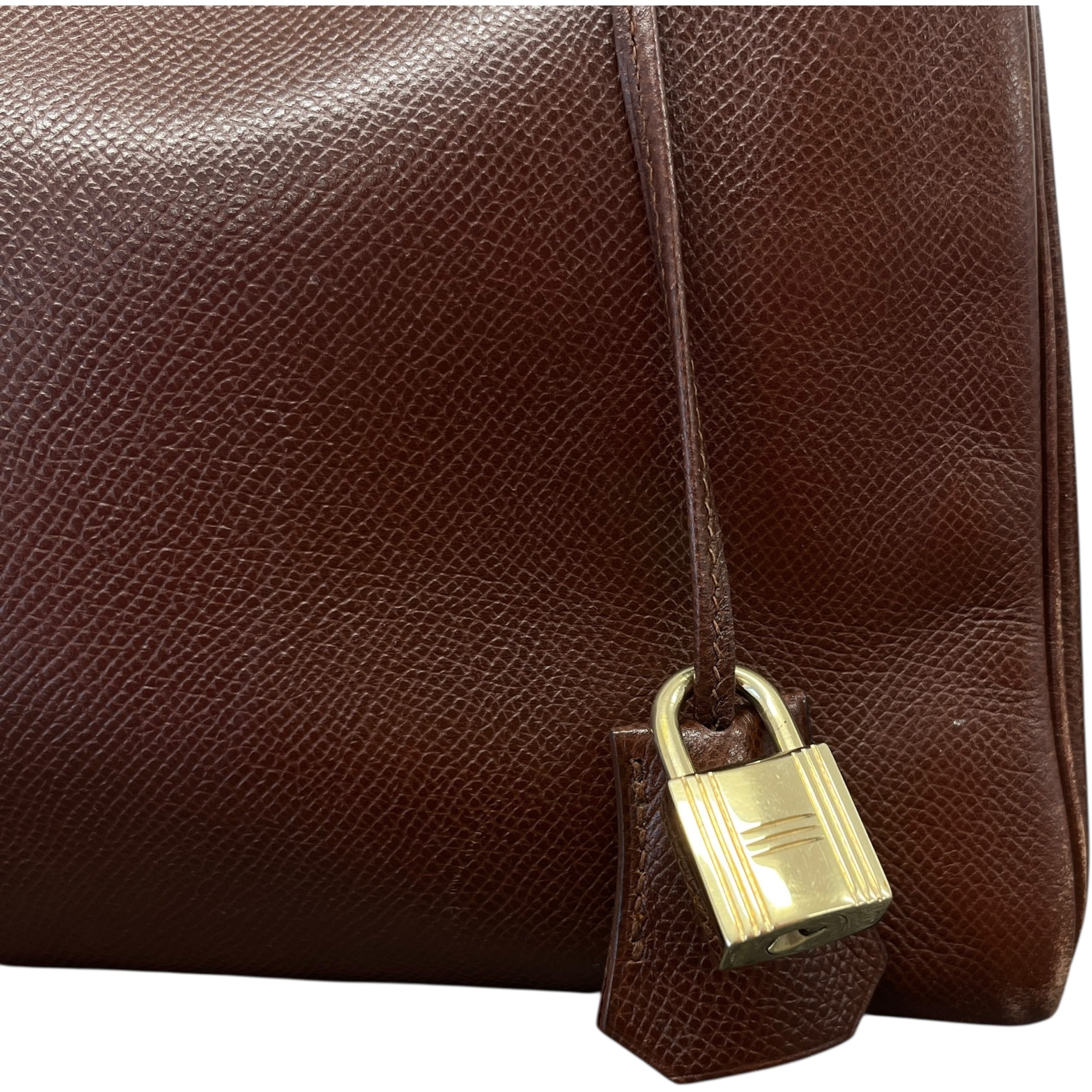 Comments This exquisite Kelly 32 is crafted from premium Courchevel leather in a rich brown hue, complemented by elegant gold hardware. A timeless vintage piece. Year: 1991 (Stamp U in Circle) Includes: Padlock, keys The bag remains in excellent vintage condition, showing only light surface level wear to the bottom corners consistent with gentle use, as detailed in the photos. The interior lining is pristine, reflecting careful ownership over the years.